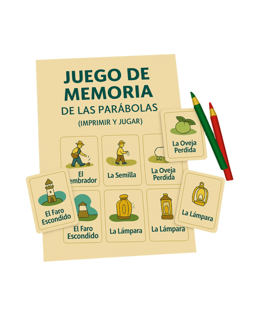 Tarjetitas coloridas con nombres y símbolos de las parábolas para recortar, jugar y memorizar el contenido bíblico con alegría.